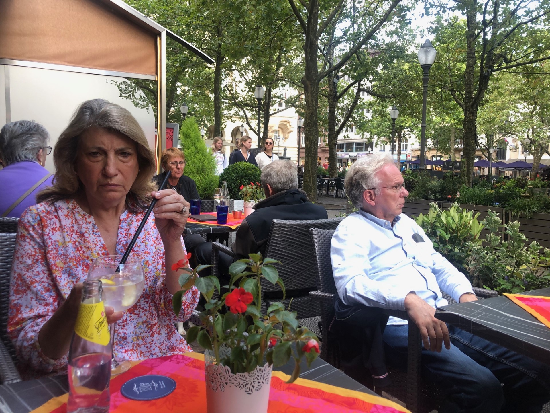 Day 1 - Sunday August 6th Left home early at 6am to catch the Channel Tunnel Shuttle just at 9.20. No problems apart from the mile after mile through Kent at 50 mph because of the 'Lorry Park'!. Pleasant and uneventful journey through France and Belgium into Luxembourg. Arriving late afternoon around 5pm and at first unable to access the hotel in a pedestrian area. Had a drink in the cafe and ate there later after a beer/wine in the cafe's outside terrace. Not shown in the pictures but there was a wildly animated guy in the corner, sadly breaking up with his wife. Shame.