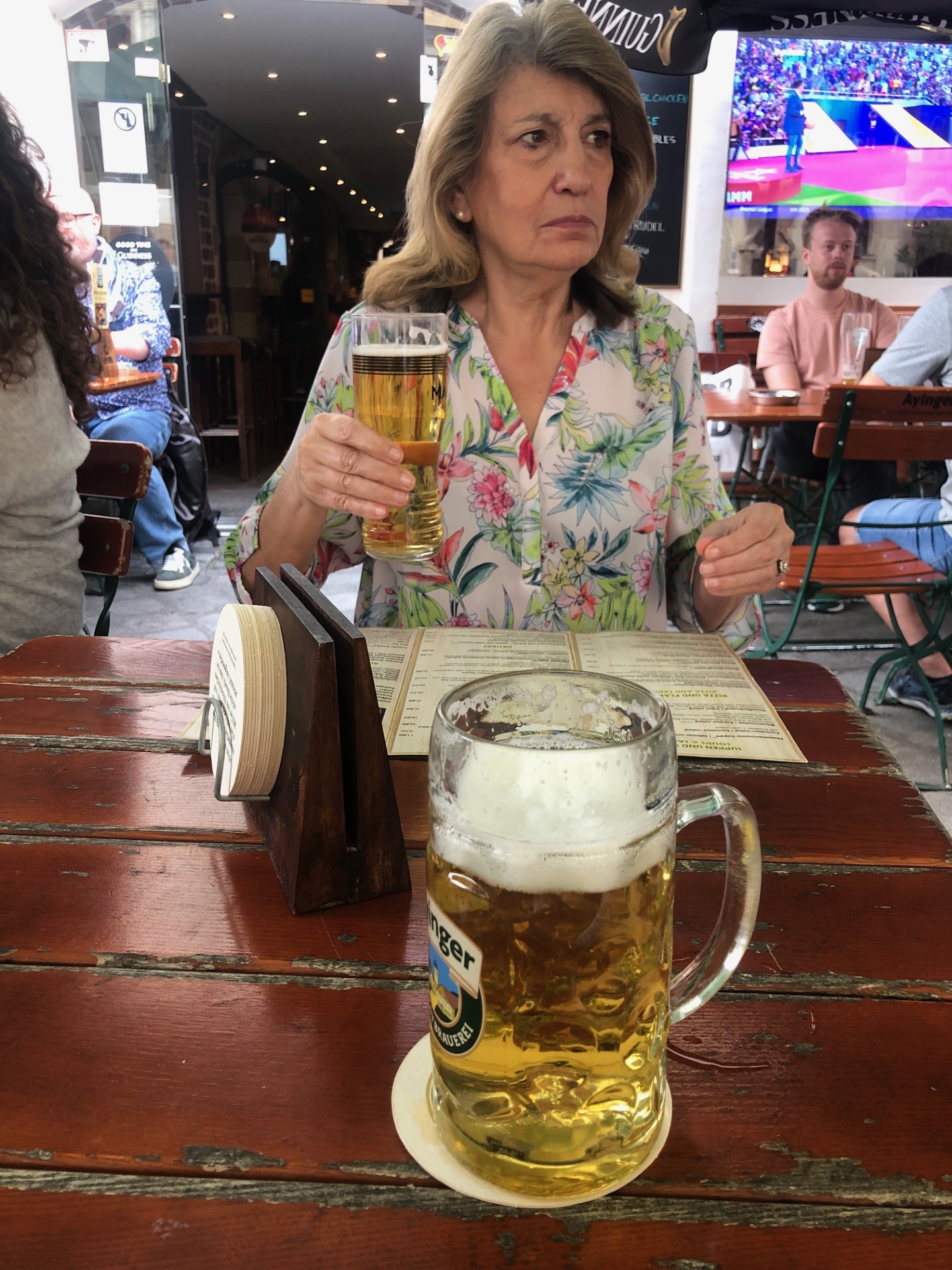 Day 3 - Tuesday August 8th On our way to Munich - but first we needed to get a green sticker. Seb had kindly gone to our house and sent a photo of the Registration Document - Remember to never leave home without it! Lynette had found a convenient site on the way in Saarlouis and we found it with no problem. No one seemed around however so we wondered into the back of the garage and had a 'chat' with the two guys there. It was not confidence inspiring but eventually they were able to issue us the ticket and apologised for not being able to charge us! We got to Munich after a high speed journey on the Autobahn. The hotel was great and we wondered into the 'Alt-Stadt' to check out the beer kellers - which were heaving with a brass band so had a meal at a street-side cafe. Back to the hotel for a night-cap.
