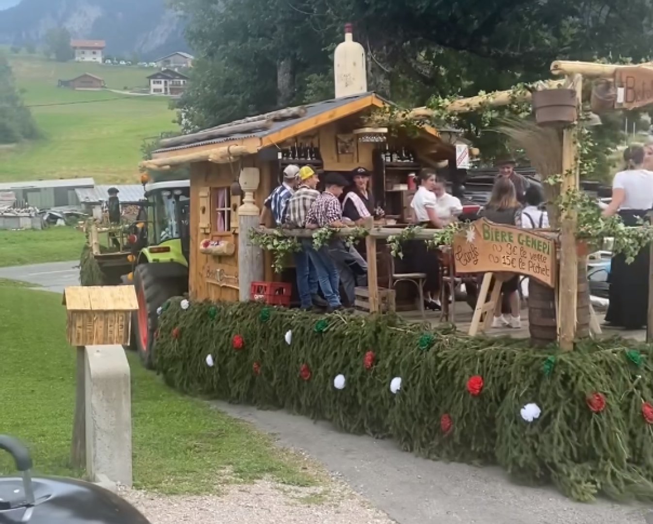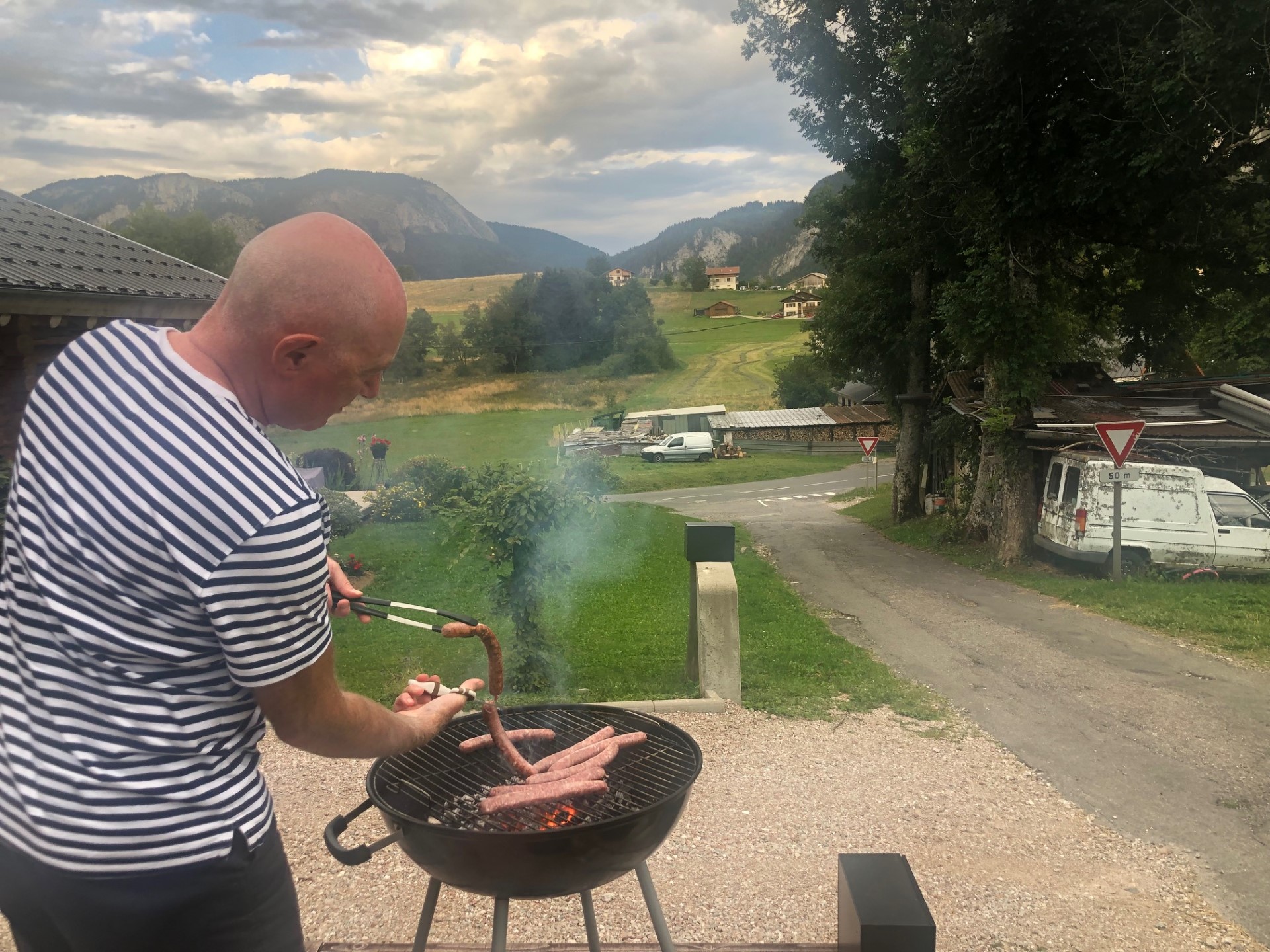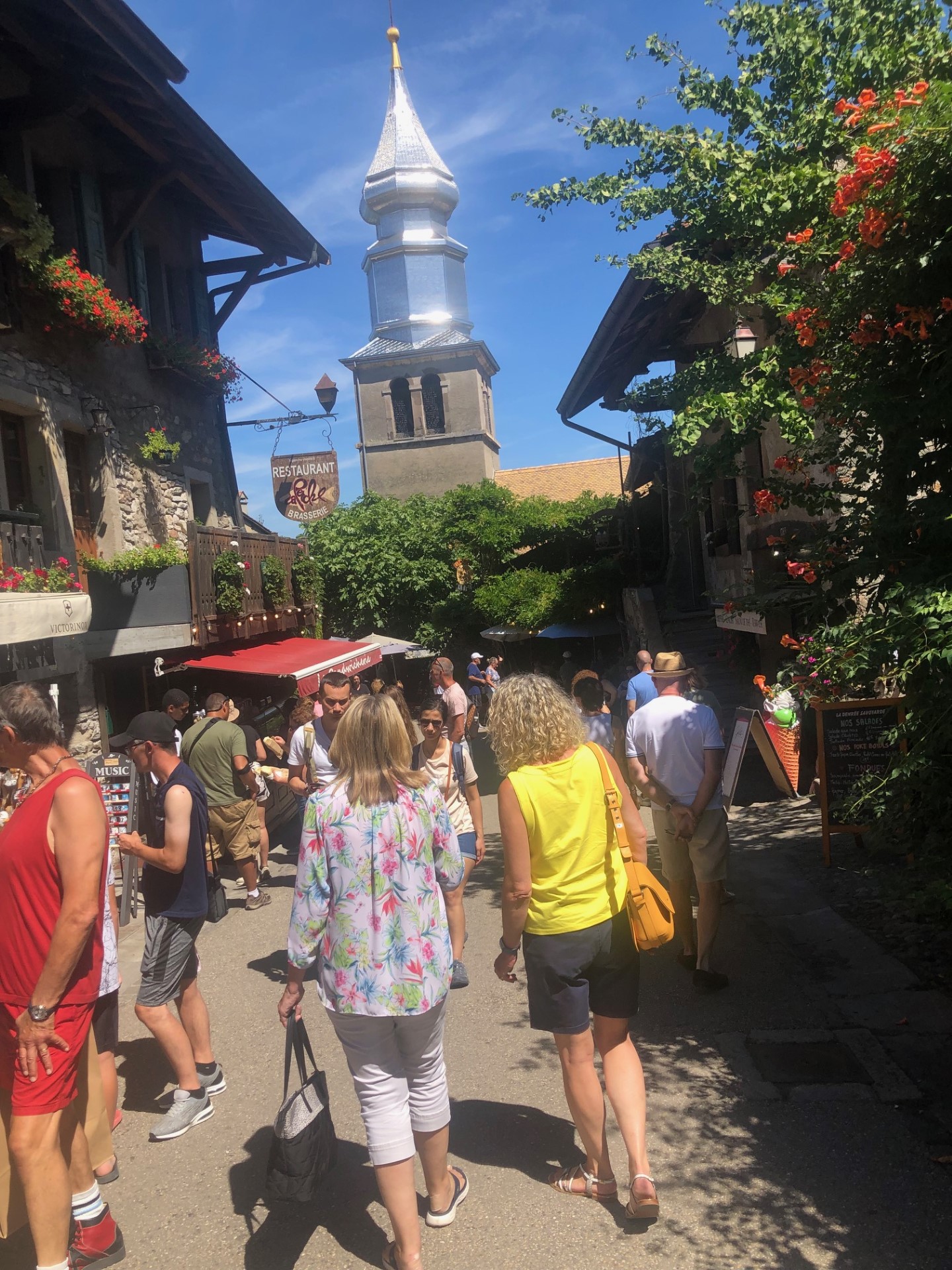 Day 6 - Friday August 11th After coffee and croissants at the nearby village, Gary took us out for a drive to a lovely town on Lake Geneva - Yvoire. Wandered round and it was fairly warm so we all needed a beer! Obviously a tourist spot but a nicely upmarket one. The shops had some lovely items of local craft work and glassware. Got back to the chalet and took things easy before heading to a local Ski restaurant for dinner. Really enjoyed it. A DIY on table BBQ with meat and cheese you cooked yourself. Really nice evening.
