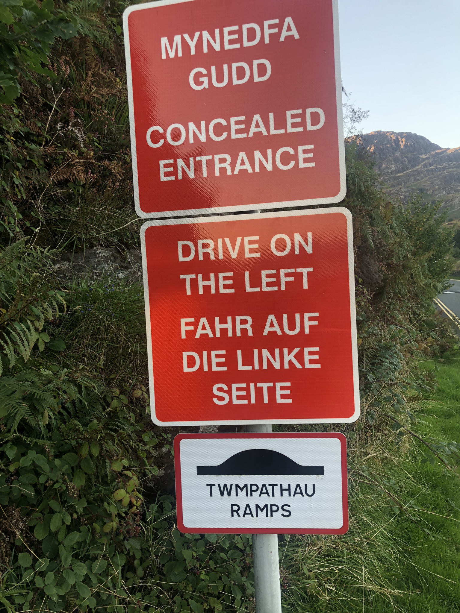 Day 2 - Wednesday - Sept 18th Started off the day with a Full English" Breakfastet at the cafe next door to the Eco House. The breakfast was perfect except for the soggy fried bread! Then set off for the day's tour. First to Beddgelert and then past the wonderful view of Snowden on the way to Capel Curig. Joined the A5 for a while before taking a left through heathland up to Denbigh before dropping down to Llangollen after lunch at the Pondorosa Cafe on the Horseshoe pass. Then back to the Eco House via Bala. Went to the Oakley House Hotel for a Shandy and Prawn Salad which looked lovely but didn't quite live up to its looks with mushy prawns! After that I wondered down towards the nearby Festiniog Power Station. A pumped power sation where water is pumped to the higher resovoir during times of high supply and low demand and allowed to return to meet high demand. Interesting Tri-Lingual signs - contractors working on a project are German! |