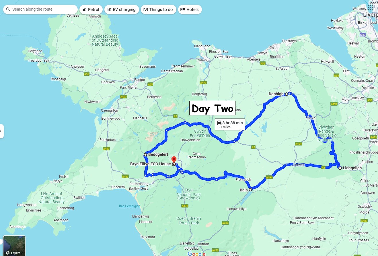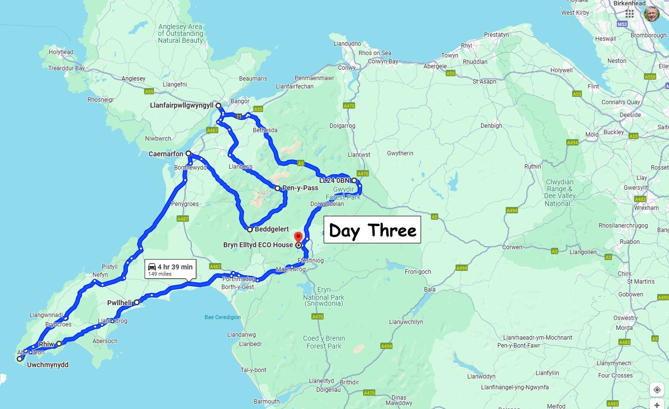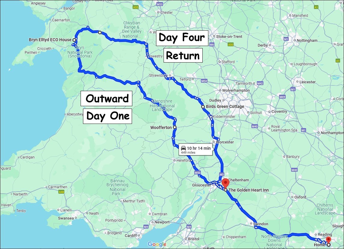 I had already put this off once or twice when the weather forecast changed for the worse but now the omens predicted fine weather for a week in North Wales. Originally I'd planned to go via Joyce and Jeff again but eventually it looked too tricky to manage, so decided to do the long trip there and back in one day each - a test for the new Tiger 900. At first I'd planned to go after the Shingles vaccine late Monday morning but that was looking challenging and when we lost the Villa keys I cancelled the original booking at the Queens Hotel Bleanau Festiniog and instead opted to the Bryn Elltyd Eco House just down the road from Tuesday to Friday.